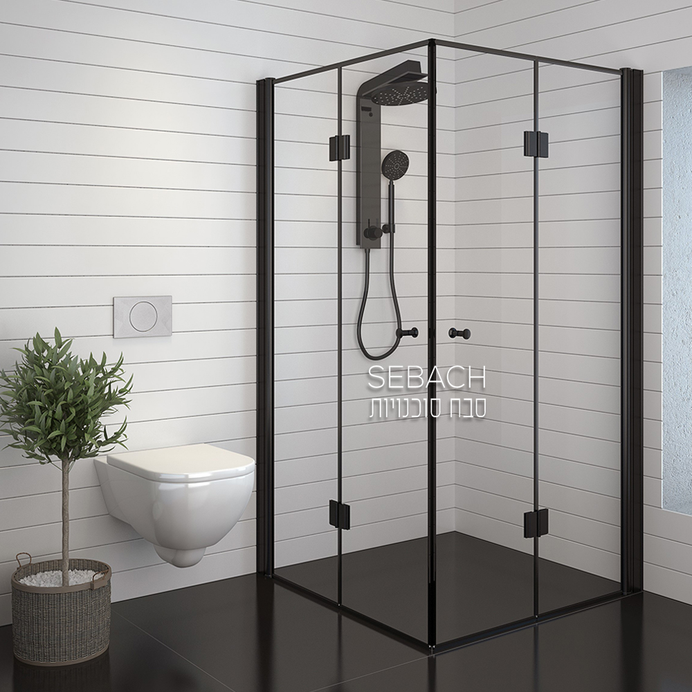 מפרט: מקלחון שתי דלתות הרמוניקה (אקורדיון) מתקפלות ונצמדות לקיר, פתיחה פנימה והחוצה, גובה 185 ס“מ