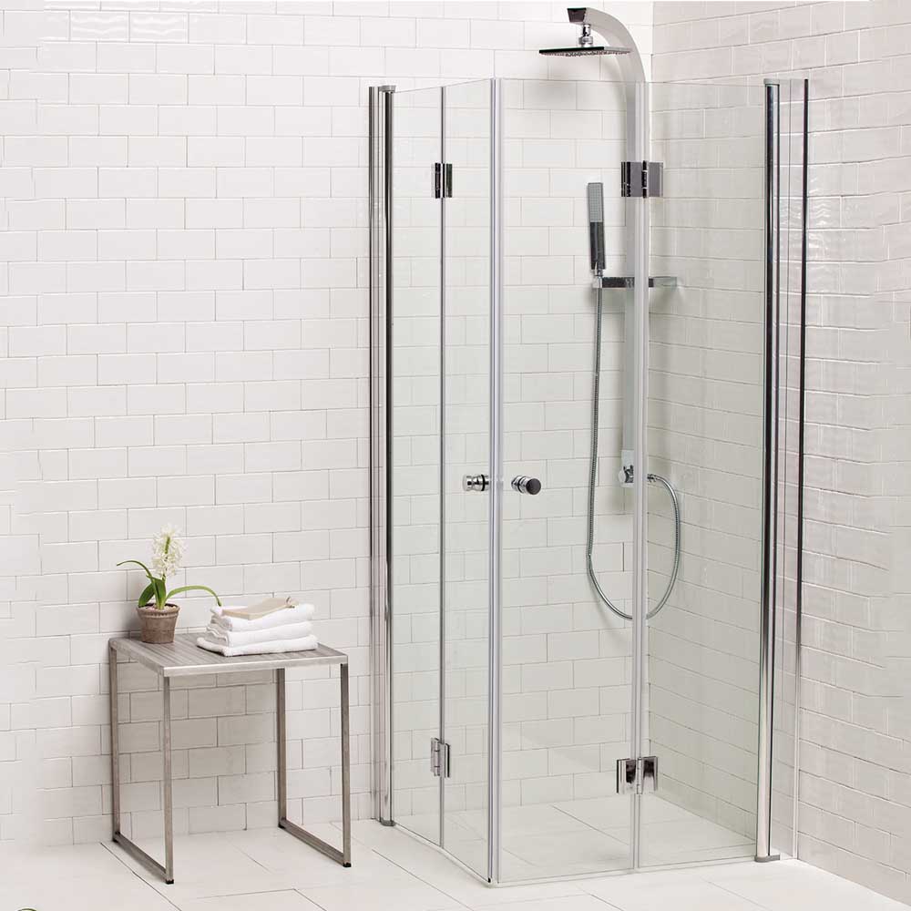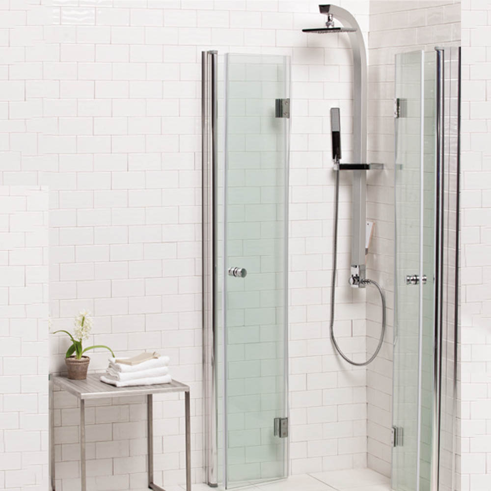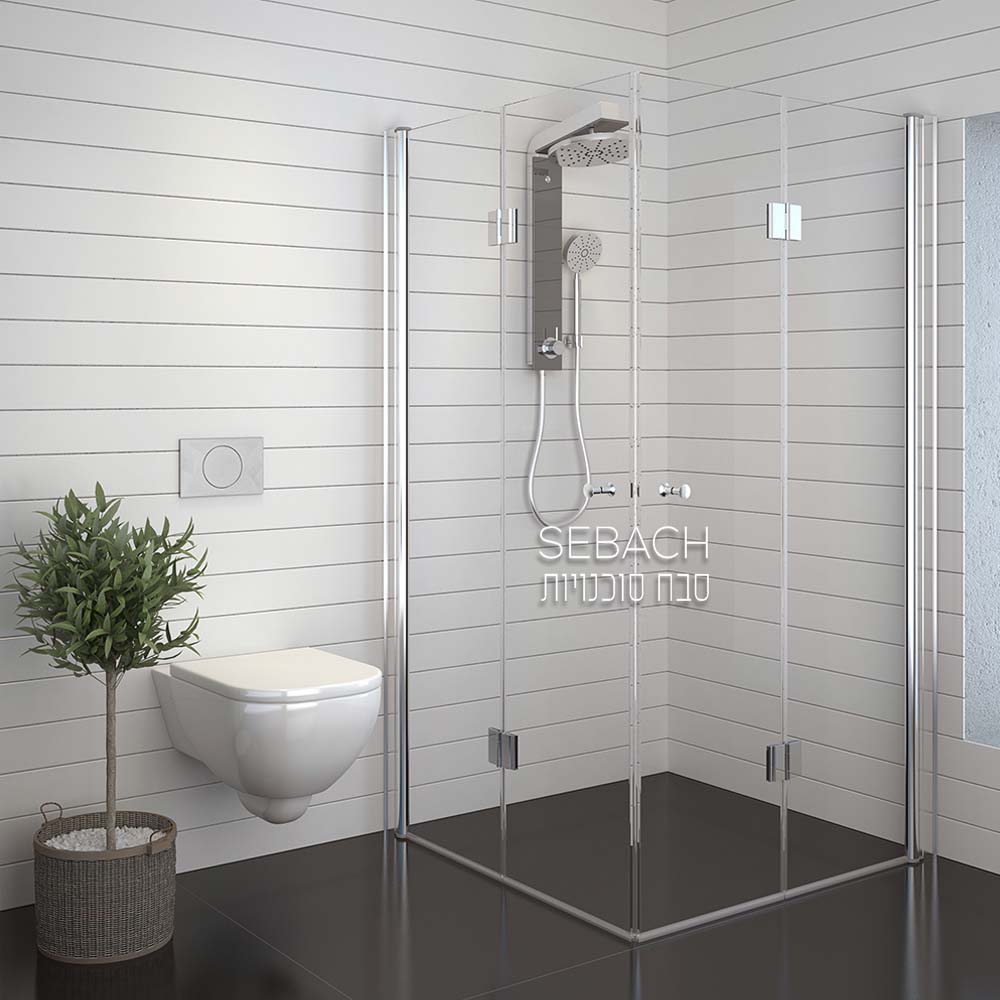 מפרט: מקלחון שתי דלתות הרמוניקה (אקורדיון) מתקפלות ונצמדות לקיר, פתיחה פנימה והחוצה, גובה 185 ס“מ